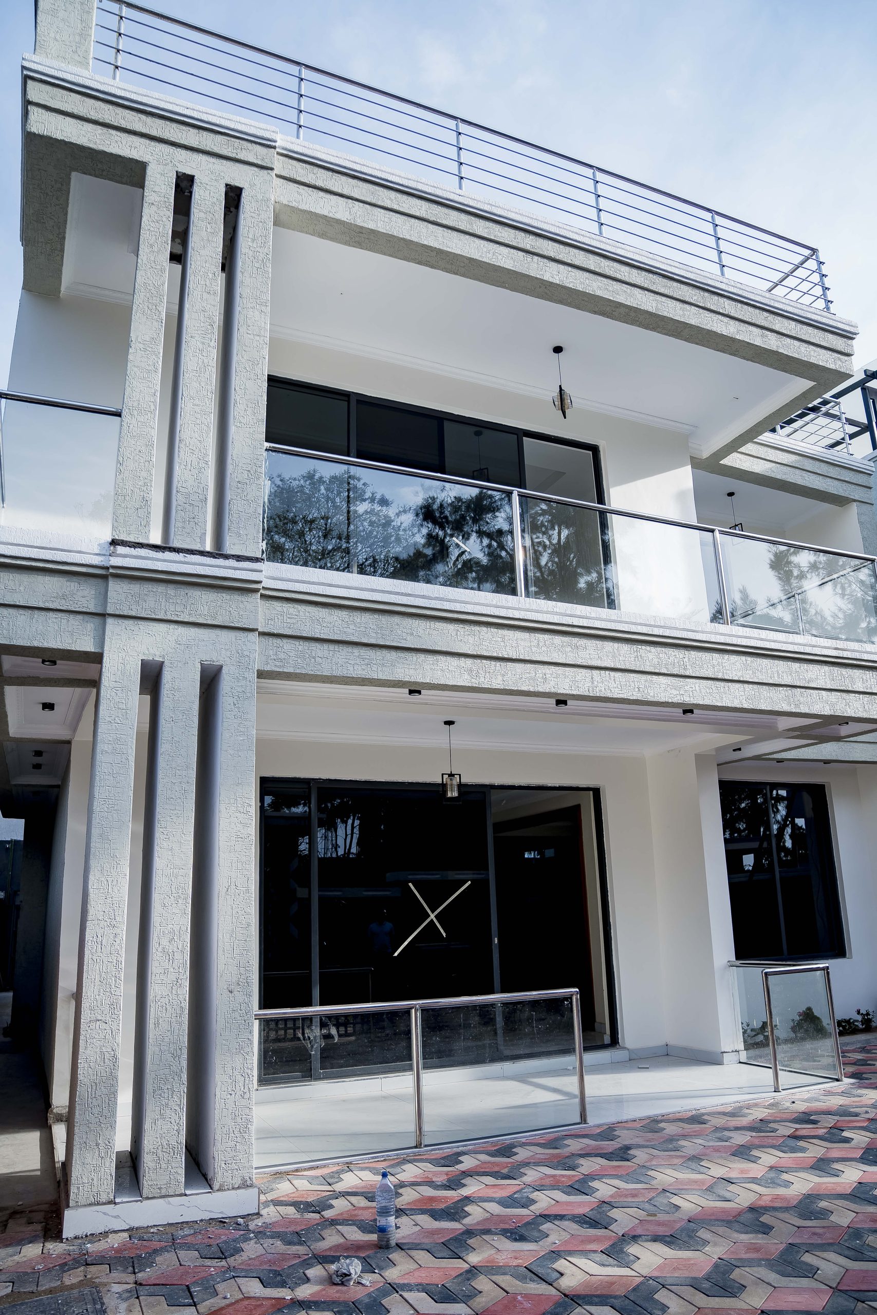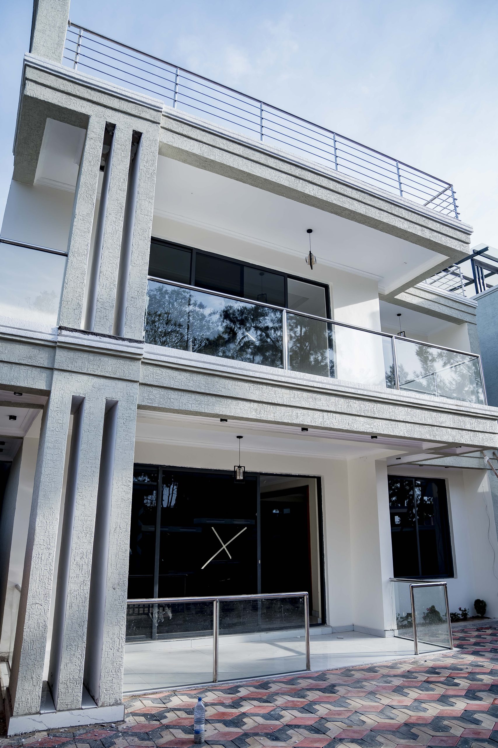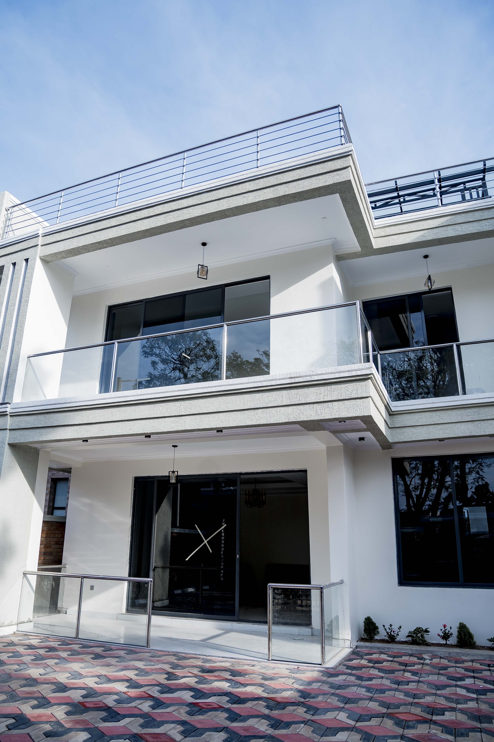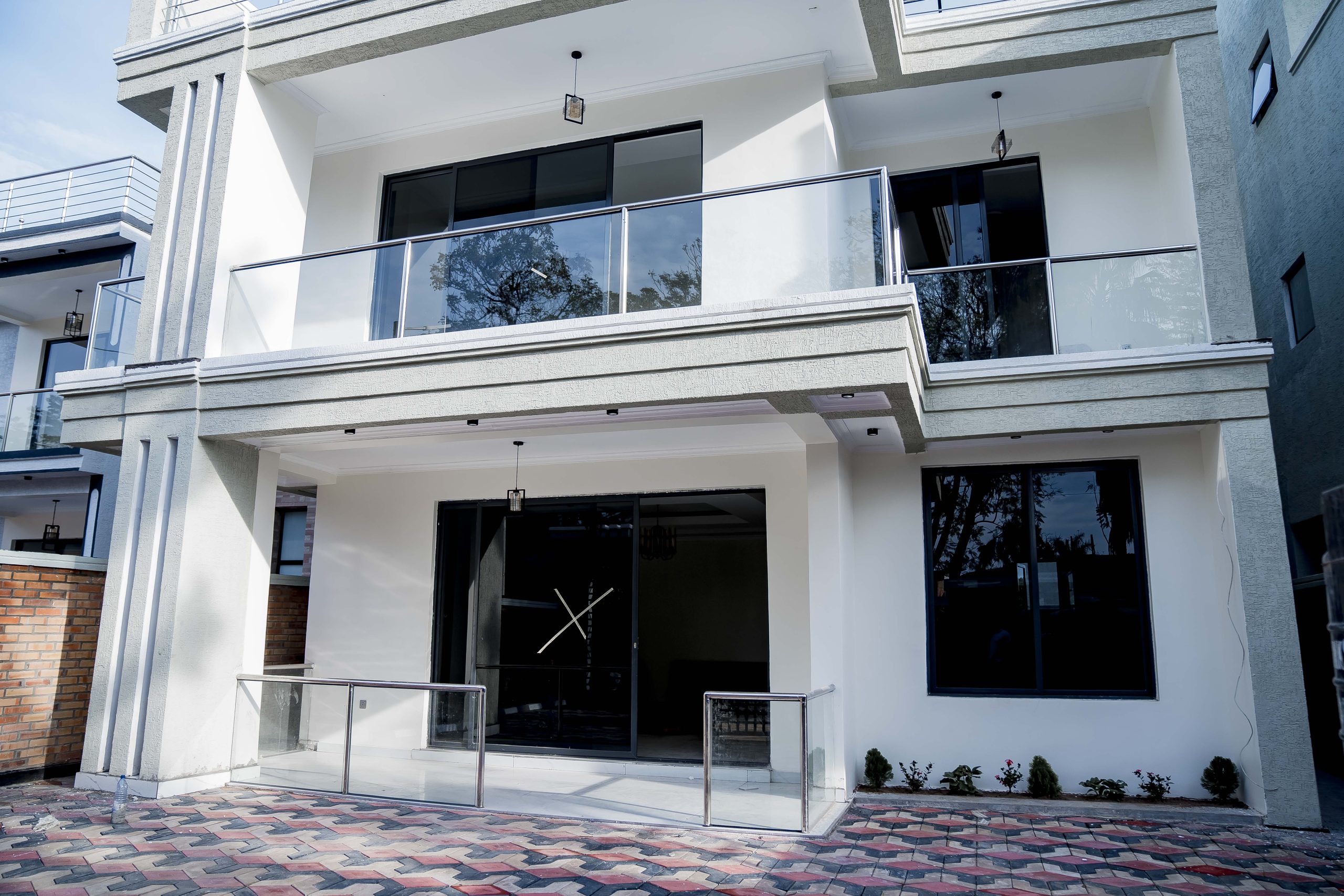 This ultra-modern G+1 executive villa in Kibagabaga stands as a flagship of contemporary Rwandan architecture, defined by its sharp geometric lines and minimalist white facade. The exterior is characterized by a bold, clean aesthetic, featuring expansive glass balconies and dark-framed floor-to-ceiling windows that offer unobstructed views of the surrounding Kigali hills. Set within a secure, gated compound, the property includes a meticulously paved driveway and professional stonework that enhances its modern curb appeal.