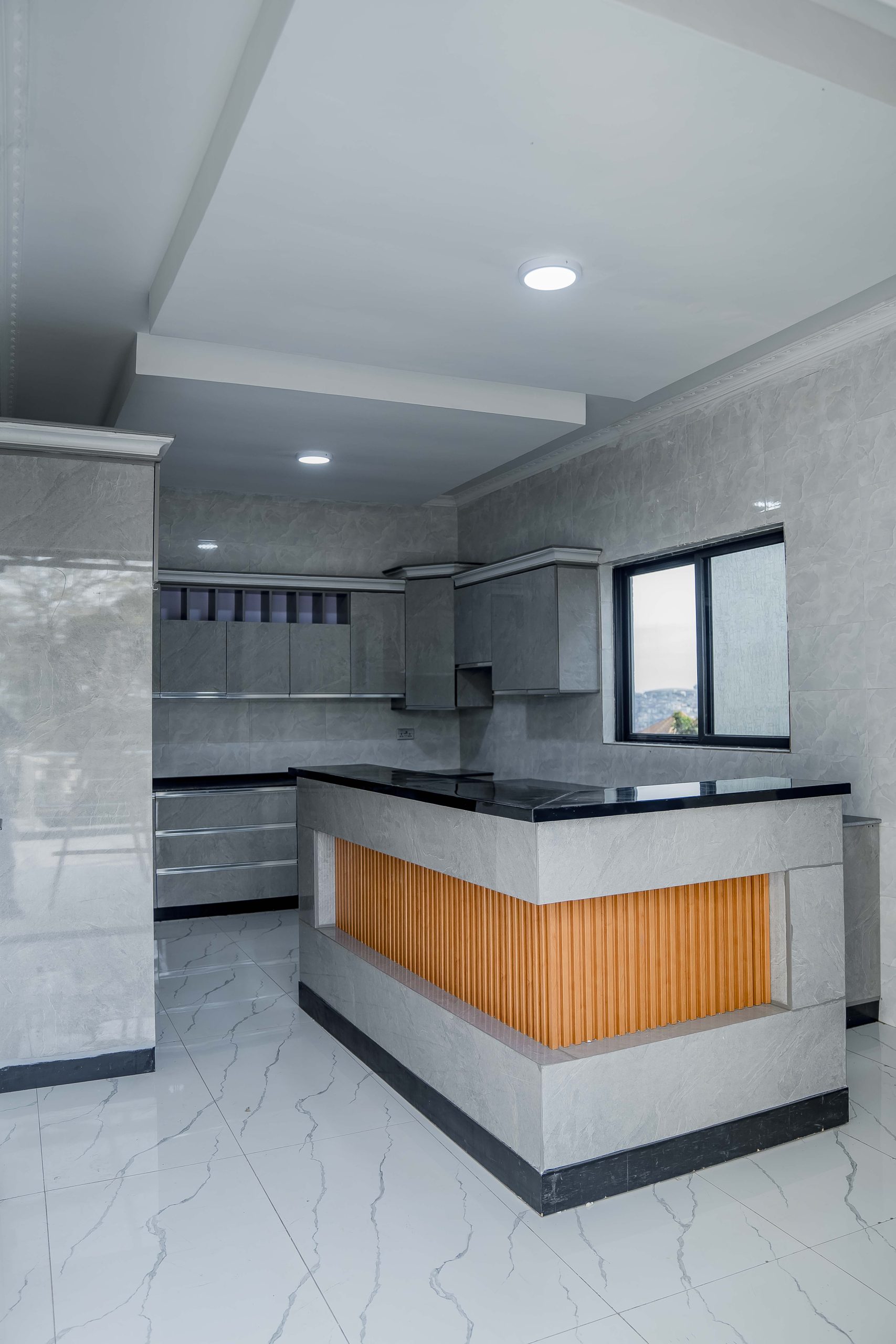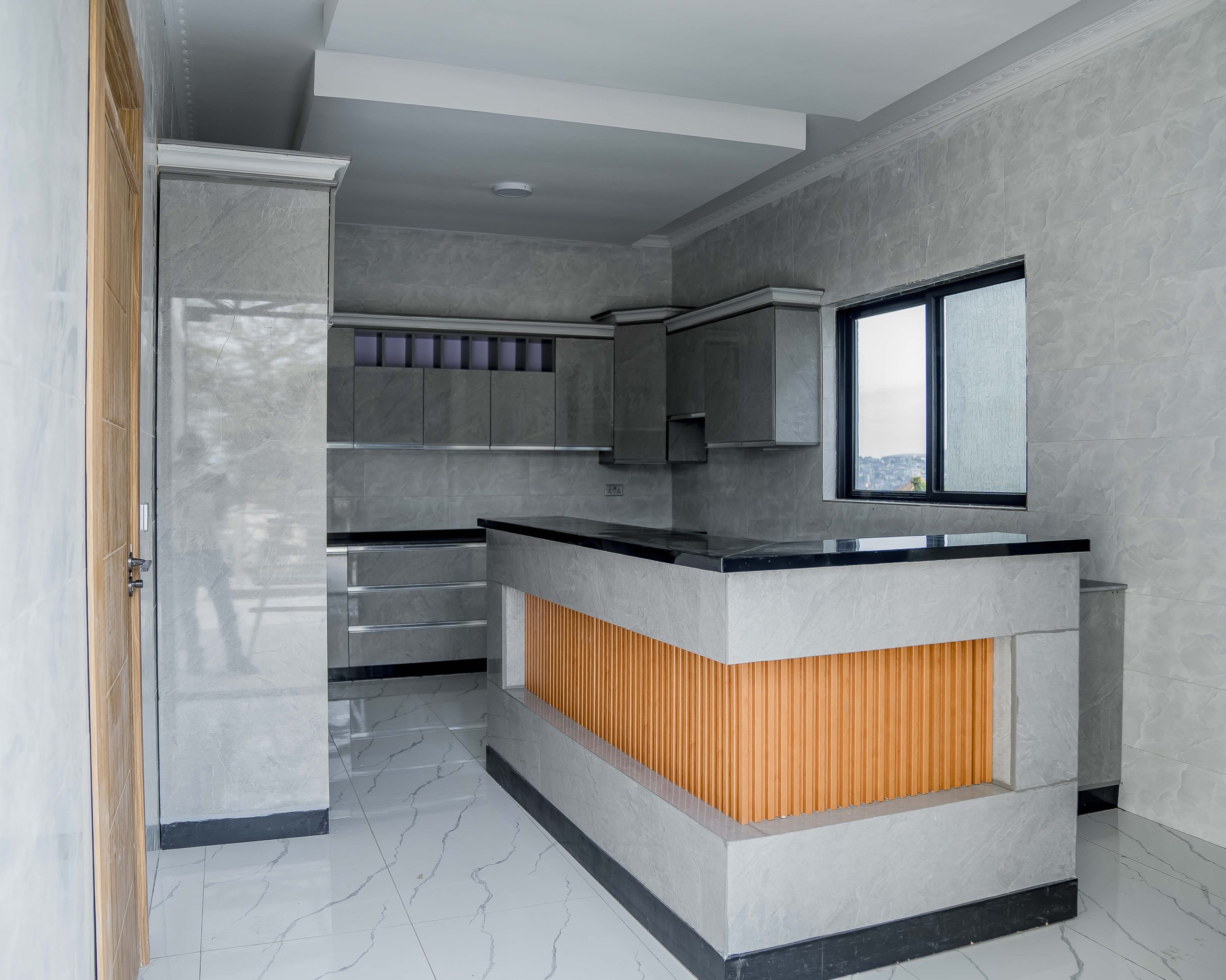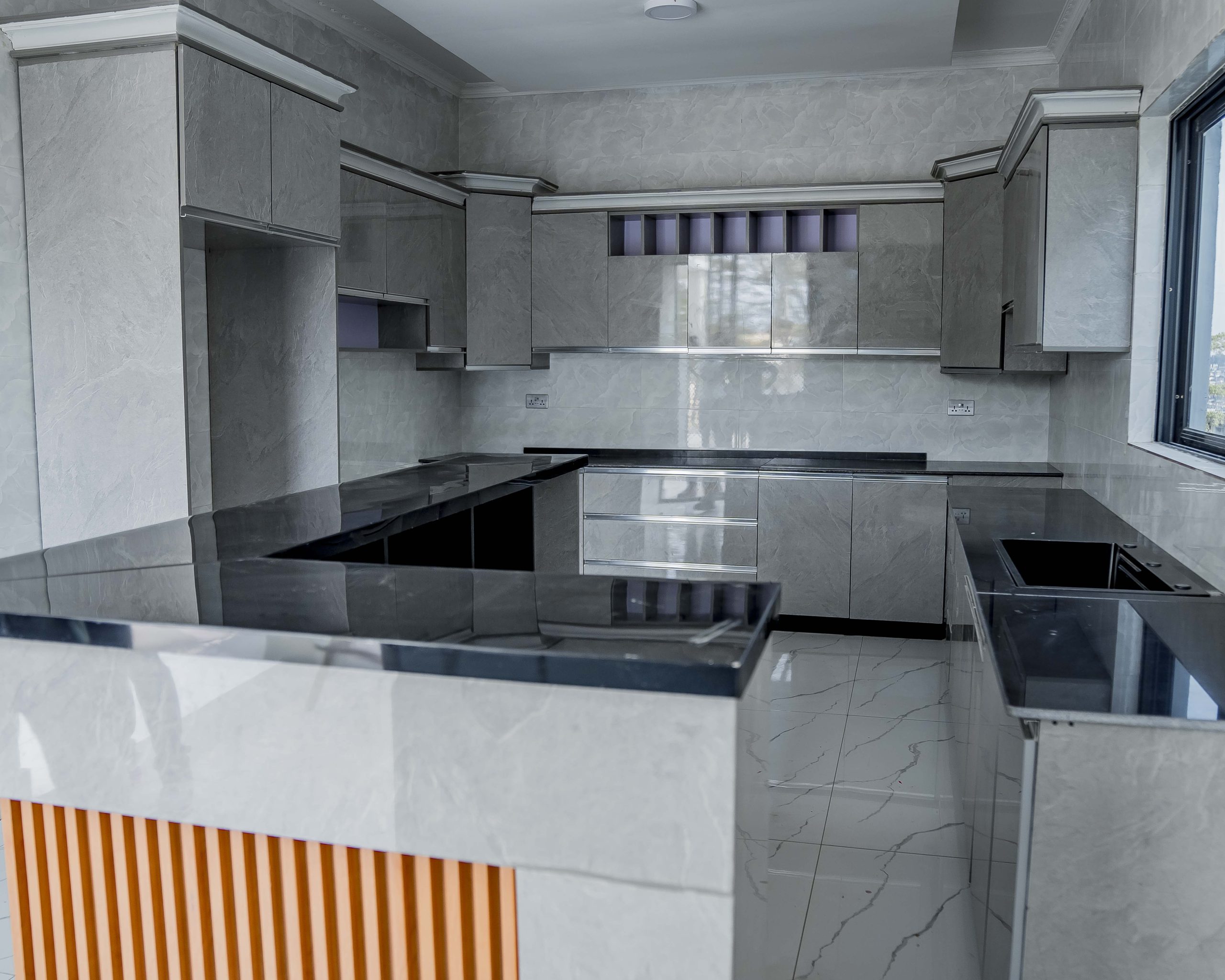 Functionality meets luxury in the gourmet chef’s kitchen, which is equipped with high-gloss minimalist cabinetry and premium grey-toned finishes. Complementing this modern core are the executive bathrooms, finished with high-grade porcelain tiles, walk-in glass showers, and designer double-sink vanities featuring integrated LED mirrors. Every detail, from the wooden door frames to the high-quality tile work, reinforces the standard of delivering lasting value in one of Kigali’s most sought-after residential nodes.