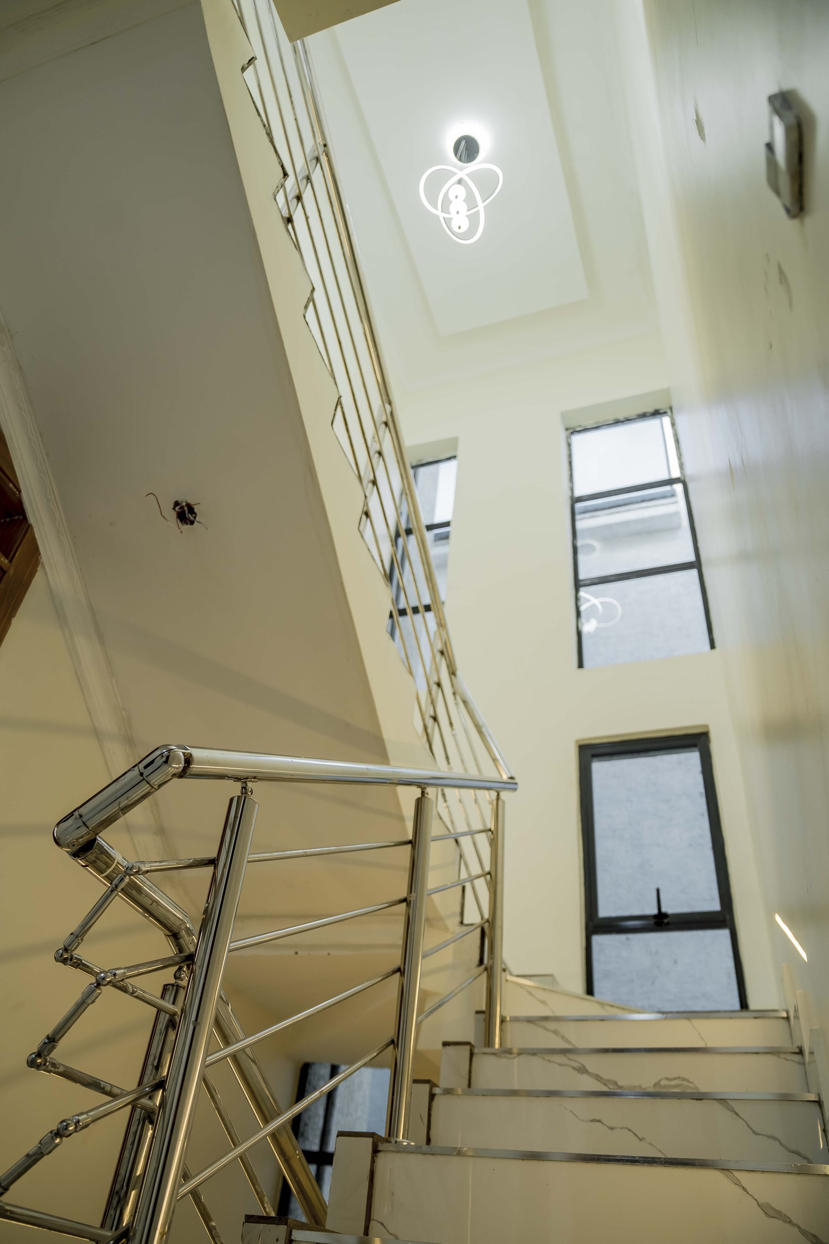 The interior of the residence reflects a “Bespoke Design” philosophy, prioritizing light and an open sense of space. A central architectural highlight is the floating staircase, which features integrated LED step lighting and sleek glass balustrades that seamlessly connect the expansive ground-floor living areas to the private executive suites above. The main living spaces are further illuminated by sophisticated recessed ceiling lighting and designer chandeliers, creating a warm yet highly polished atmosphere ideal for both family life and high-level entertaining.